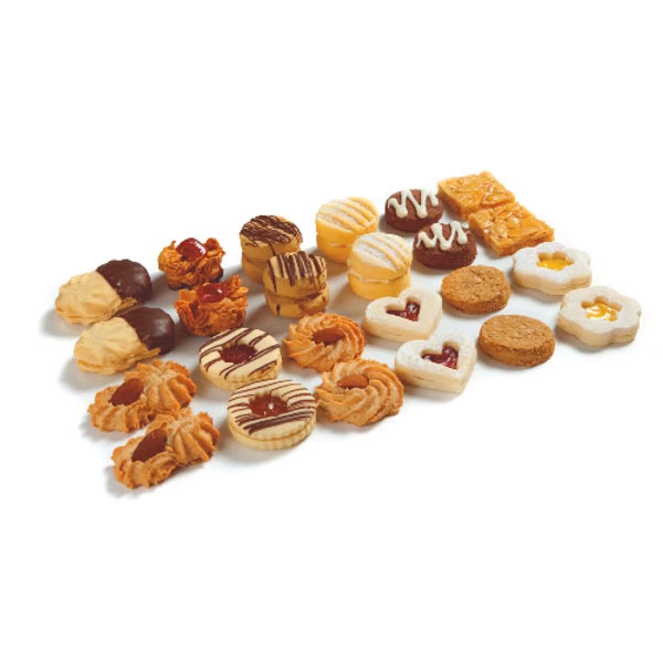 A nut-free hand-crafted selection of petite size White Chocolate and Cranberry Slice, Anzacs, Monte Carlos, Yo Yos, Choc Macaroons, Passion Fruit Shortbreads, Jam and Choc Rounds, Jam Hearts, Viennese Eclairs, Coconut Macaroons and Triple Choc Chip.