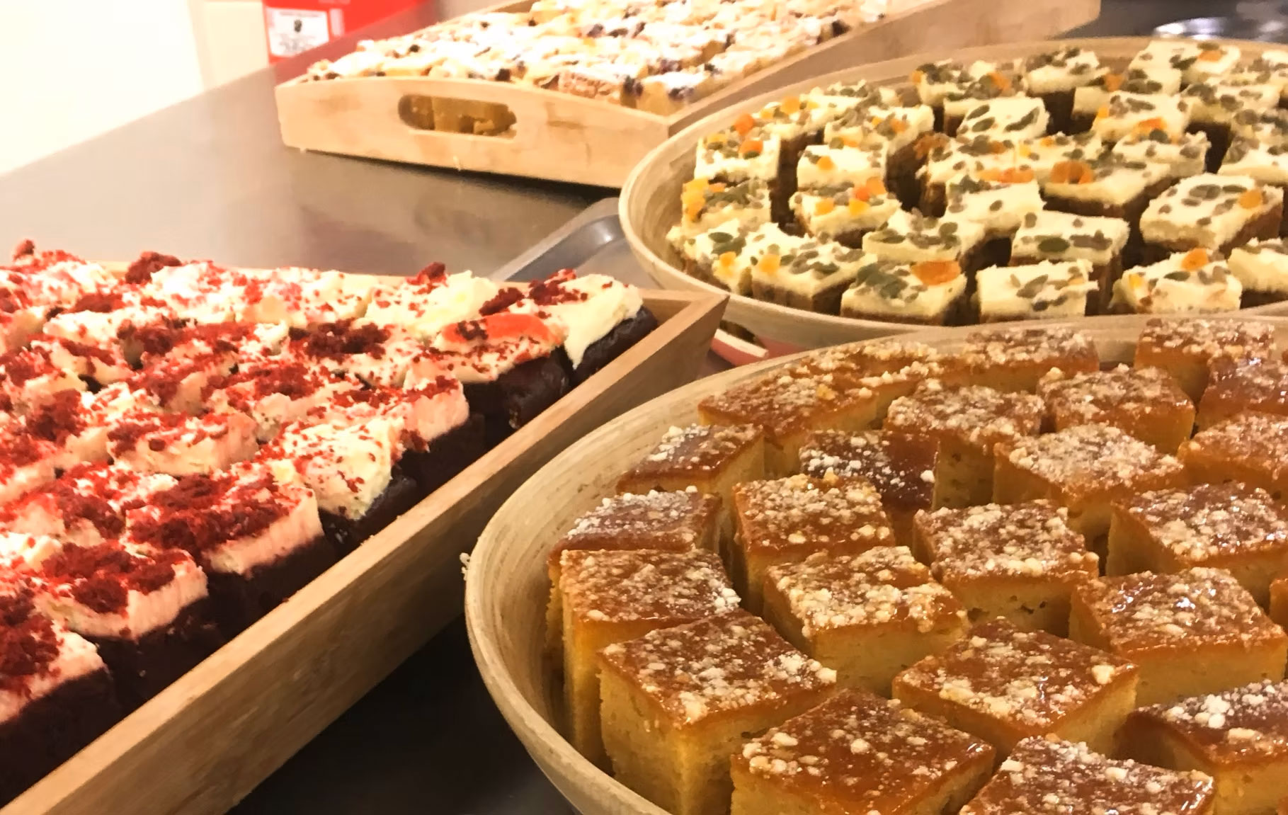 Monte Carlos, Passion Fruit Shortbreads, Jam Shells, Salted Caramel Eclairs, Florentines, Pistachio Yo Yos, Gingerbread Slices, Coconut Macaroons, Cranberry and White Chocolate Slices, Almond Shortbreads, Chocolate Macaroons, Jam and Choc Rounds.