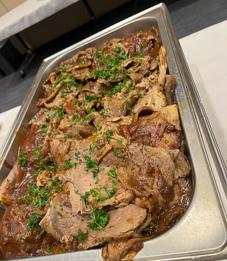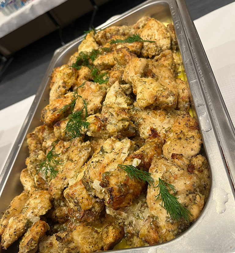 Packed in foil oven trays we precook this package for you to reheat in the oven. We include plates, napkins and sauces.